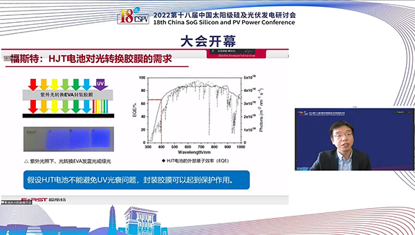 2022年12月8日至10日,第十八屆中國太陽級硅及光伏發(fā)電研討會(18th CSPV)在山西太原舉行。本次會議采取線上論壇的形式召開,福斯特等光伏企業(yè)協(xié)辦。在會議首日主會場論壇中,福斯特總經(jīng)理周光大博士針對光伏市場主流的新電池技術闡述了福斯特的理解,提出了專業(yè)的解決方案,并做了題為《新型高效電池的封裝方案》的報告。