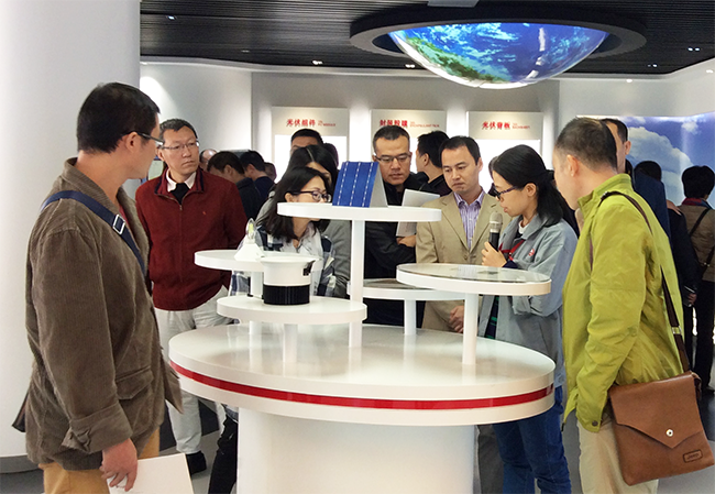 在研究院,考察團聽取了公司相關負責人關于企業發展歷程、經營業績、主營產品EVA膠膜和背板的介紹。同時,了解了企業在新材料領域的研究成果,近距離接觸、觀察企業產品。